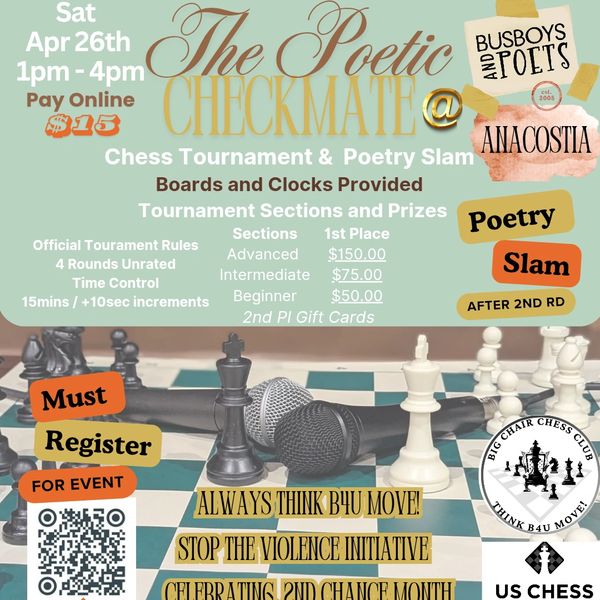 Between chess rounds, enjoy engaging performances, poetry, and entertainment with a special guest host! This is more than a tournament—it’s a DC community experience filled with strategy, art, and culture.