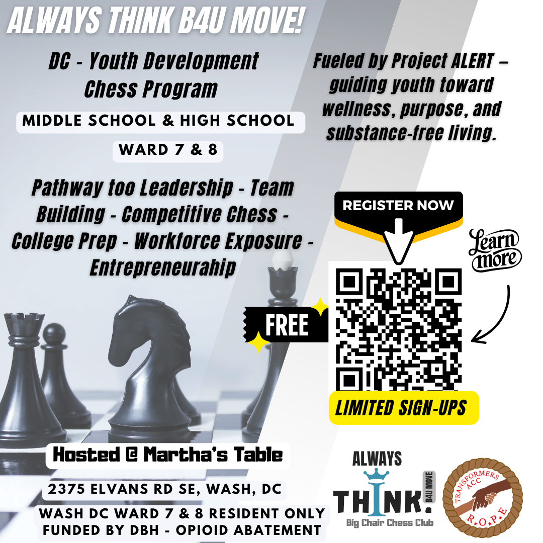 The Big Chair Chess Club Youth Chess League (YCL) is dedicated to empowering middle school and high school students in Washington, D.C.’s Ward 7 and Ward 8 through chess. Guided by our motto, “Always Think B4U Move!”, the program helps youth build stronger decision-making skills while promoting academic excellence, leadership, and positive life choices. Our mission is to provide young people with safe and structured opportunities that keep them away from drugs, crime, and violence—encouraging them instead to pursue excellence and contribute something better to their community. YCL members will also have the opportunity to compete in local and national events such as the DC Scholastic Chess Competition, city championships, National Chess Championships, and even Super Nationals, which may involve travel outside the state.